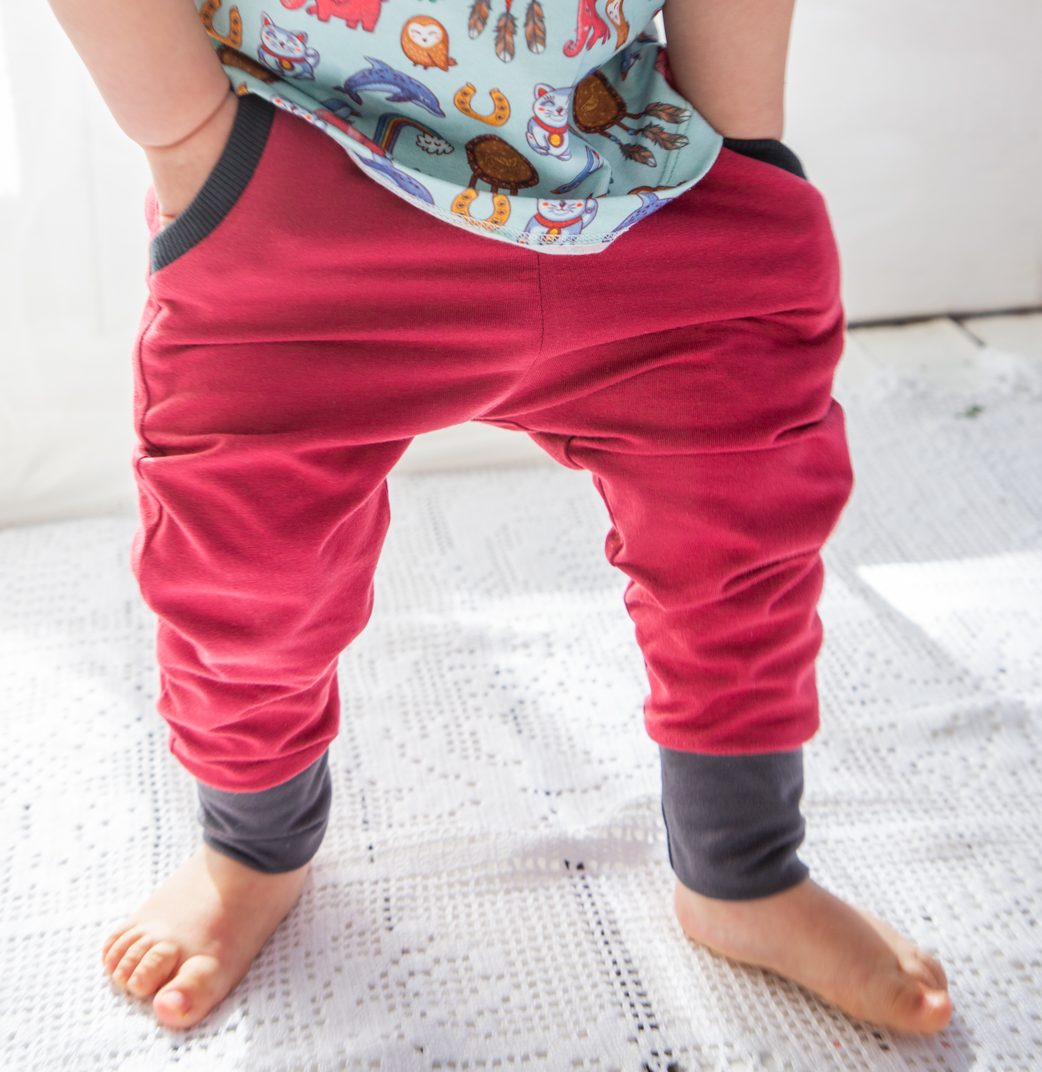 Pantalón niño en punto de algodón orgánico con bolsillos y puños en color contrastado. Lleva goma con ojales ajustable a todas las cinturas. Un basico de armario que no te defraudará.