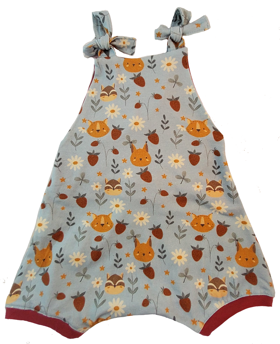 Pieza de cuerpo entero en algodón, tirantes regulables y abertura inferior para facilitar el cambio de pañal.