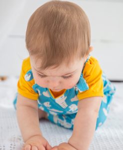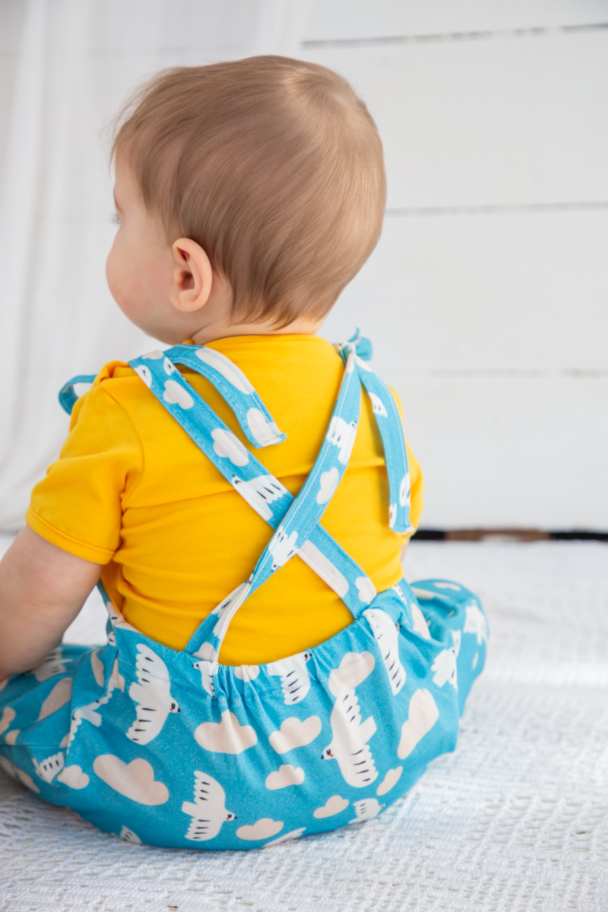 Pieza de cuerpo entero en algodón, tirantes regulables y abertura inferior para facilitar el cambio de pañal.