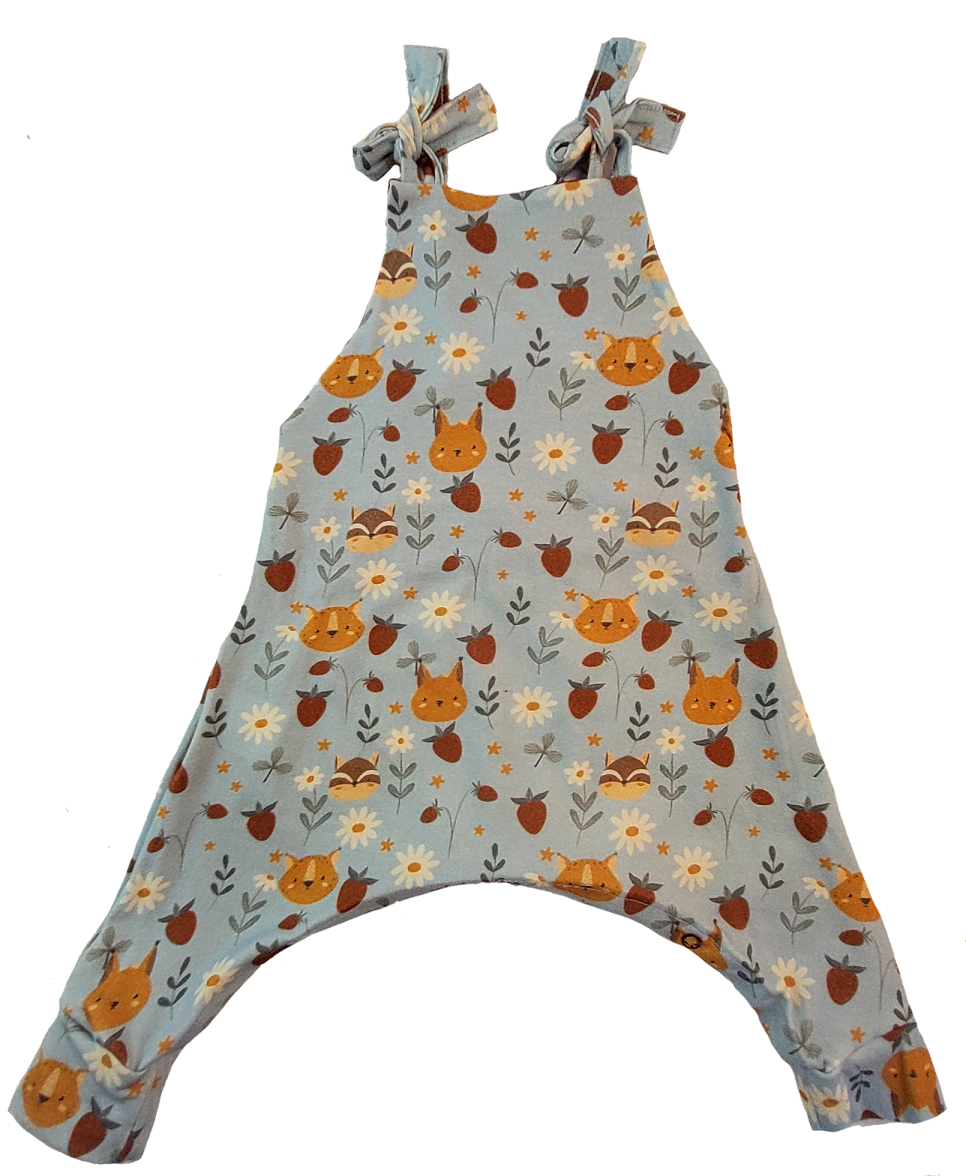 Pieza de cuerpo entero en algodón, tirantes regulables y abertura inferior para facilitar el cambio de pañal.